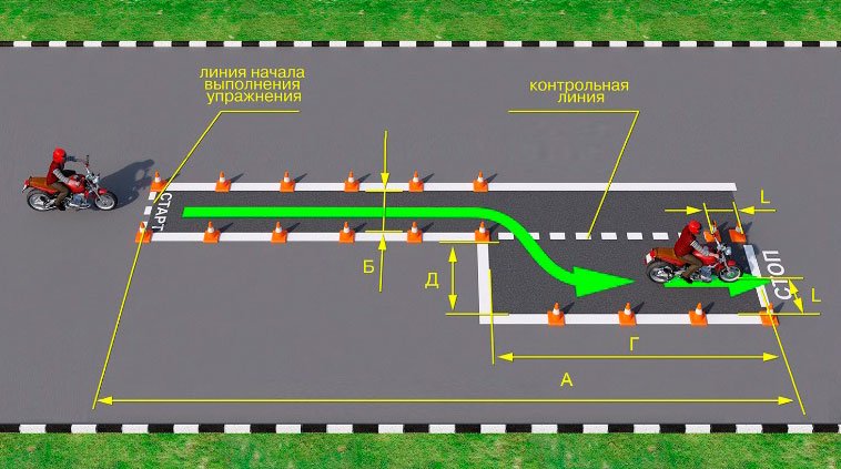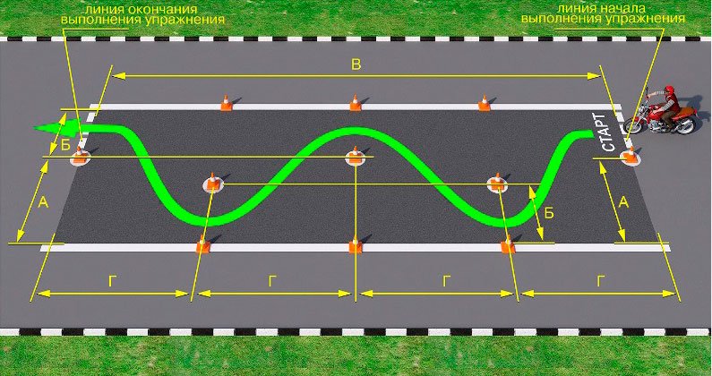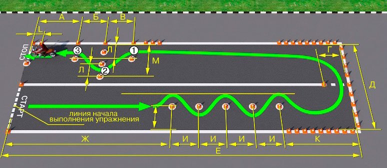 Упражнение состоит из 4-х элементов: «Габаритная восьмерка», «Змейка», «Скоростное маневрирование» и «Габаритный коридор».