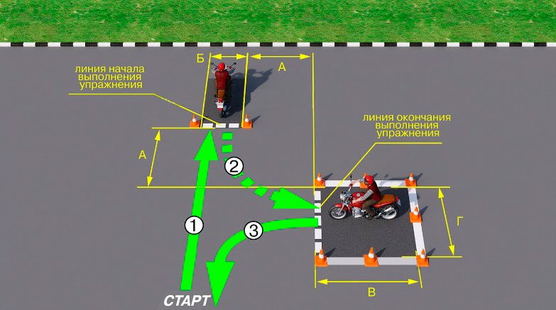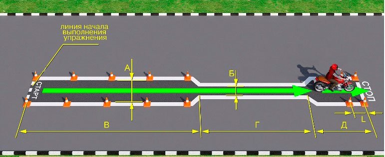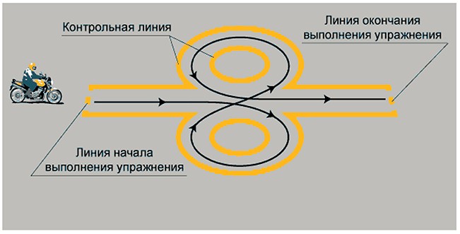 Кандидат в водители после пересечения на мототранспортном средстве линии начала выполнения упражнения останавливается в обозначенном месте так, чтобы мототранспортное средство по проекции заднего габарита пересекло линию начала выполнения упражнения, выключает двигатель и спешивается (рисунок 5).
